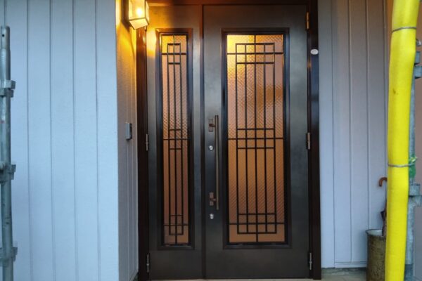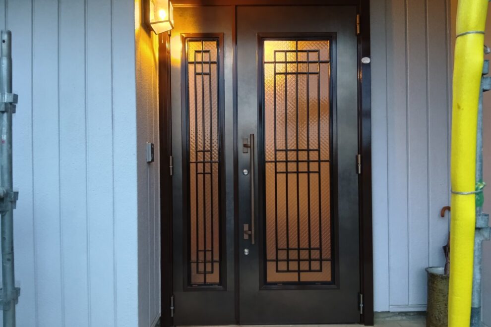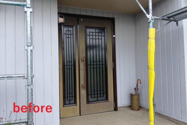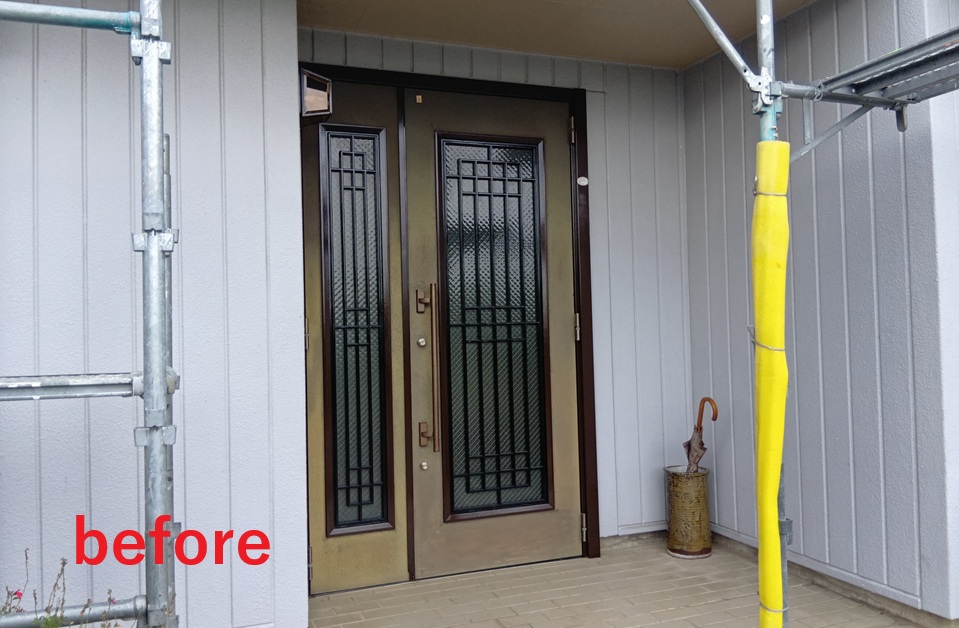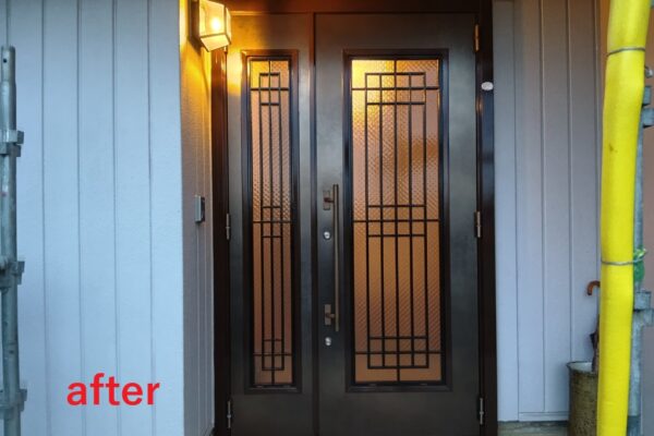 玄関扉にダイノックシート(接着剤付きの化粧塩ビフィルム)を貼り、玄関のリフォームをいたしました。お使いの玄関ドアにシート状のフィルムを貼るだけでイメージチェンジができます。単色カラー・木目調・石調など豊富なラインナップからお選び頂けます。