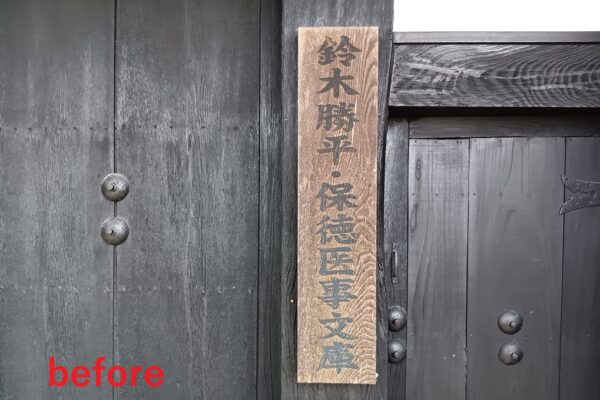 10年の時を経て変色した表札銘板をリノベーションさせていただきました。新しい木目が美しく出るまで丁寧にペーパー掛けを施し、文字を書き直した上で、オイルステインとクリア塗装で仕上げました。元の素材をそのまま活かすことで、お客様の大切な思い出や歴史が詰まった代々受け継がれる表札を、長くご愛用いただけるよう仕上げております。